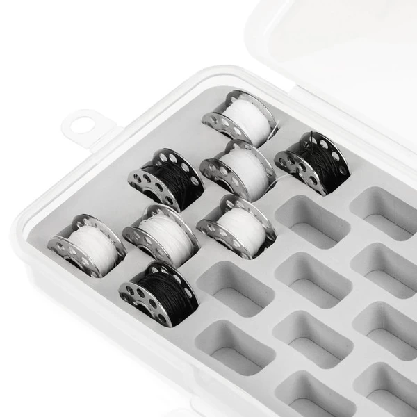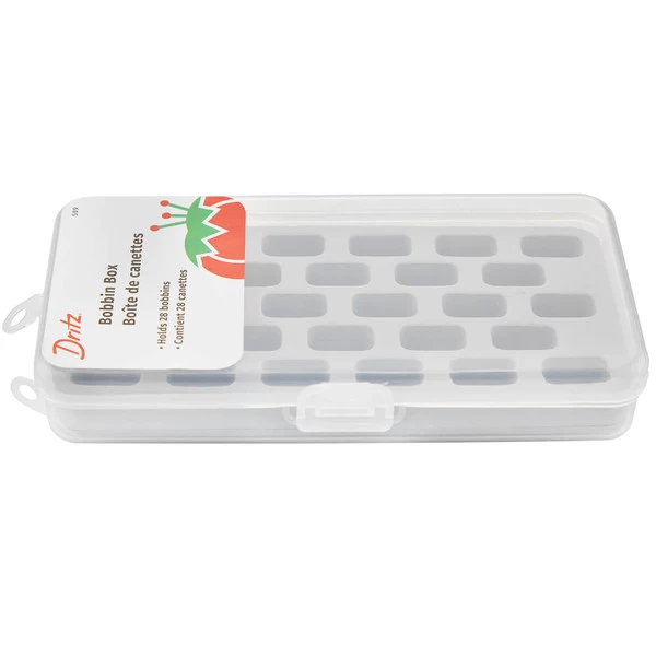 Conveniently store your bobbins in this handy case! This Bobbin Box holds up to 28 Style A bobbins and comes with a removable foam insert. The clear lid allows you to see thread colors. (Bobbins and thread not included.)