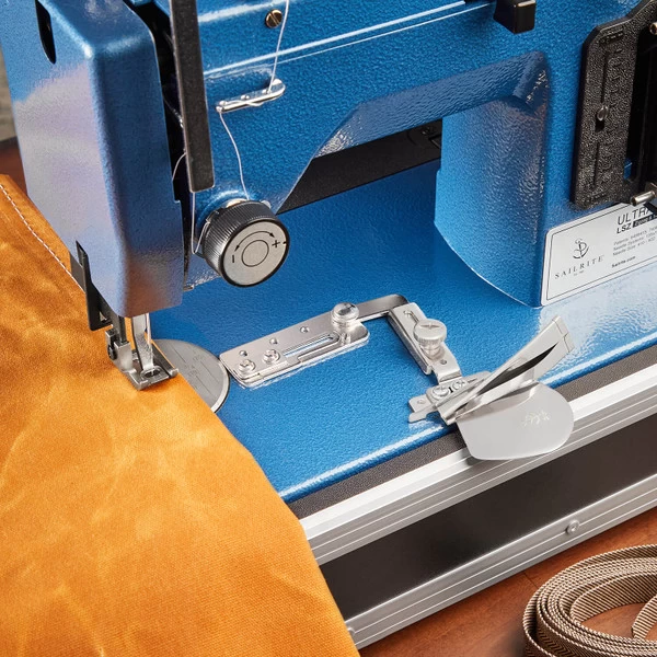 Sailrite’s Swing-Away Binder is a high-quality design manufactured in Japan. The binding feeds smoothly and folds evenly, even at sewn splices in the binding tape. This swing binder features an exclusive stop screw, which prevents the binder from jumping over its frame and being pulled into the needle when sewing heavy items. This “stop” is a must when using a powerful walking foot sewing machine.