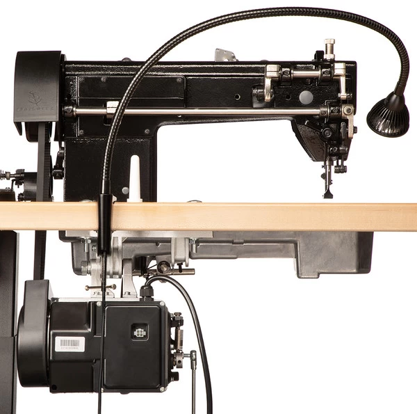 Take your sewing to the next level! This Fabricator package comes with some impressive additions for a superior sewing setup. The machine head and oil tray sit in a custom maple butcher block table for a craftsman-inspired look. The black, powder-coated table legs are made from a high-quality steel and are designed for easy height adjustments. Every sewist needs a convenient space for storing notions, which is why we’ve included cutouts on the tabletop for storing bobbins and other notions within easy reach. To top it all off, we’ve included the Sailrite® Industrial Flexible LED Sewing Machine Light for optimal sewing visibility. This sturdy, sleek light has a flexible 26-inch neck so you can position it exactly where you need it. With five watts of power and a lifespan of 50,000 hours, you will have a bright, concentrated beam of light in hard-to-see places. With a strong G-clamp base, this light is easy to install on your work surface and will hold strong. Assembly of the table is required.