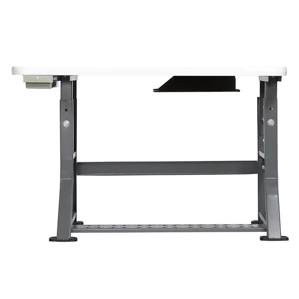 The tabletop is custom made for Sailrite in the USA from 1-1/2-inch thick, sturdy plywood. The table is laminated with melamine on both the top and bottom. Laminating the table bottom increases table strength and prevents the table from bowing from the weight of the machine. Included in this table package is a threaded insert that lets you easily install your existing Integrated Thread Stand (not included in table package) directly into the tabletop. The tabletop surface measures 47-1/2 inches wide x 20 inches deep with a 14-3/4-inch x 7-1/8-inch cutout for the sewing machine. The tabletop sits on our sturdy, metal K-Leg Table Frame. Raise or lower the height on these legs from 28 to 34 inches for the most comfortable sewing position. An included oil tray helps to prevent oil drips. The legs measure 16-5/8 inches from front to back and the frame width is 38 inches.