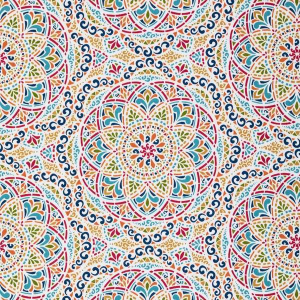 Solarium® Fiesta is an outdoor upholstery fabric from Richloom Fabrics Group. Perfect for your porch or patio, this polyester fabric features a bright and colorful suzani medallion motif pattern that will add a splash of style to your outdoor seating. Solarium Fiesta is UV and fade resistant for up to 500 hours, as well as water, stain and mildew resistant.