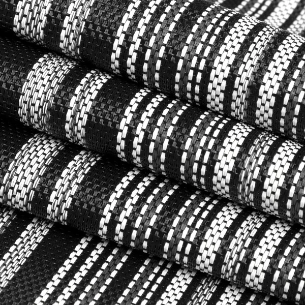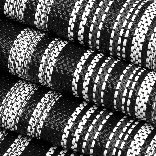- 100% vinyl-coated polyester fabric in a striped pattern of black, charcoal and white.