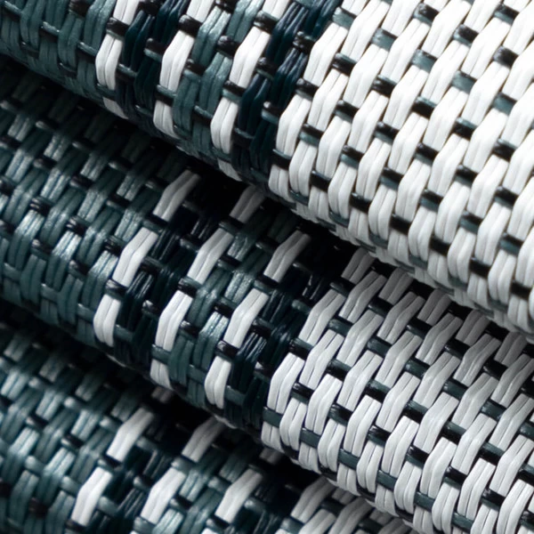 - 100% vinyl-coated polyester fabric in a striped pattern of blue tones, gray and white.